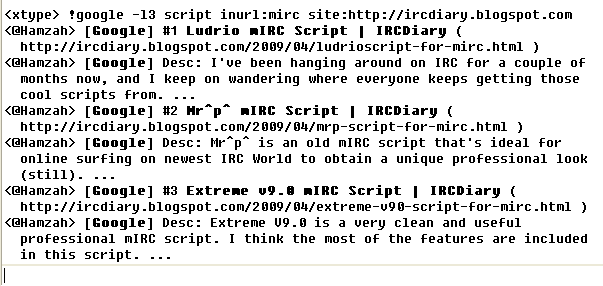 That was the tested one when the addon received simple triggered command such !google Introduction to IRC Internet Relay Chat. You can make limited search results by using -l[any.number.you.like] additional command. And it also supports several advanced operators of google seach features such site:, inurl:, intitle:, related:, allinurl: ect. This picture shown at the below is taken from my own experiment with this addon, I think you would be clear about all those things which I’m trying to explain: